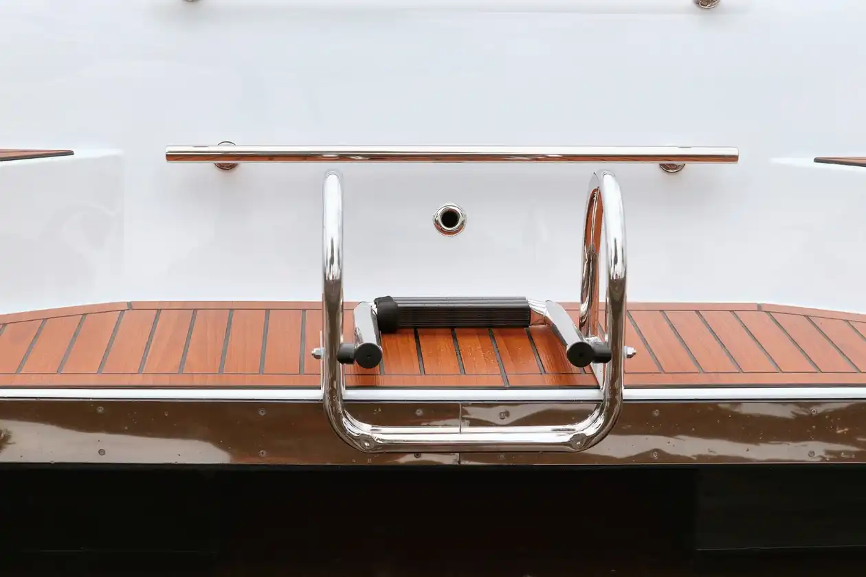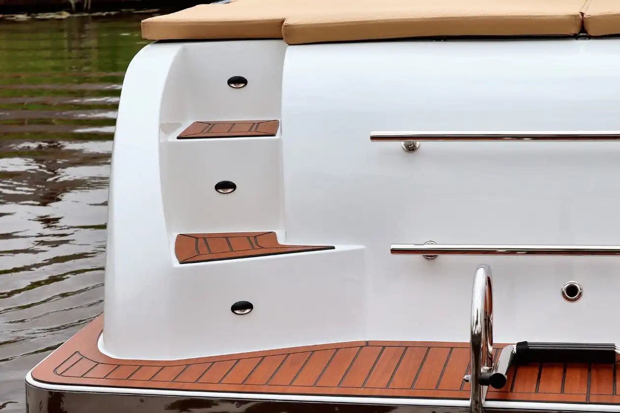 De 630 heeft een gesloten achterzijde met brede instaptreden, afgewerkt met RVS handgrepen. Dit geeft de sloep een elegante en rustige uitstraling én praktische instap vanaf het zwemplateau.