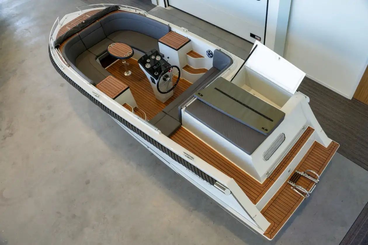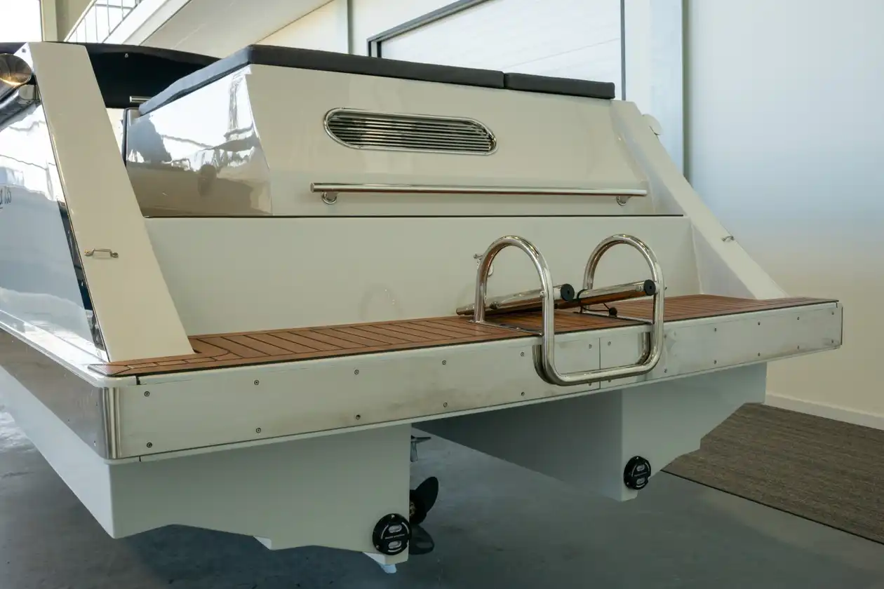 De praktische doorloop tussen kuip en zwemplateau maakt instappen eenvoudig. Zo stap je moeiteloos in en uit het water, zonder over banken te hoeven klauteren. Perfect voor een frisse duik, het aanmeren of een ontspannen moment met je voeten in het water.